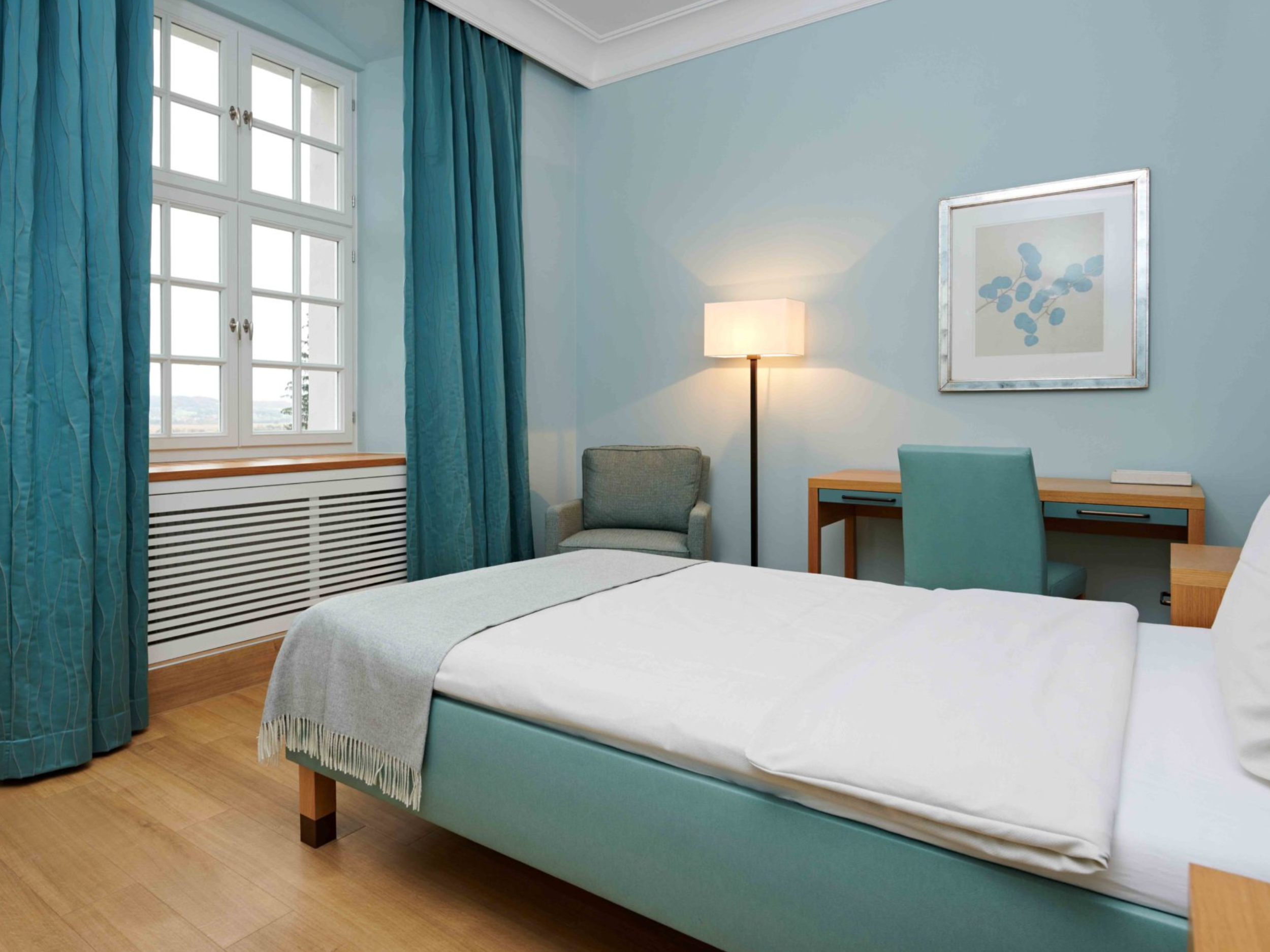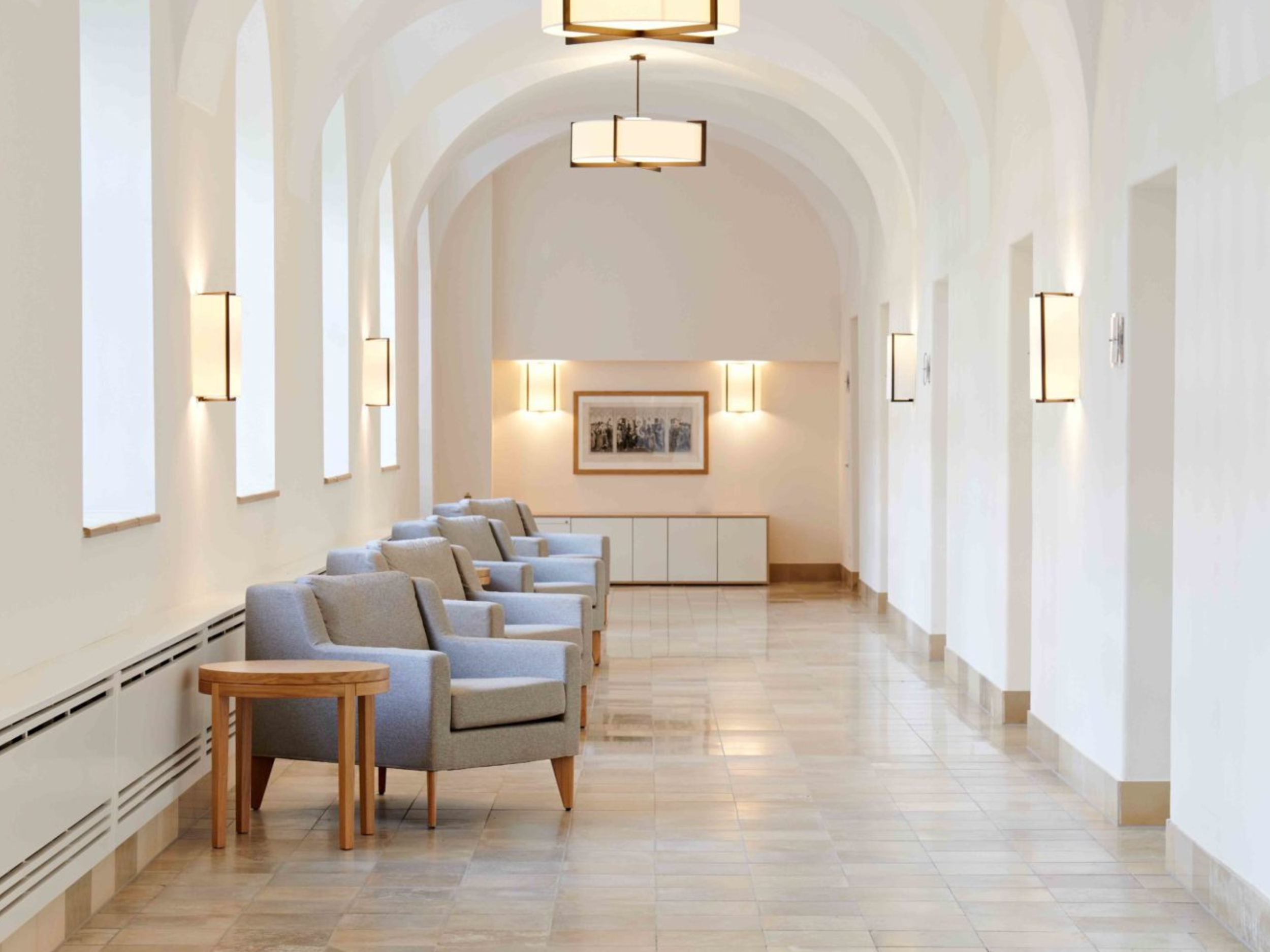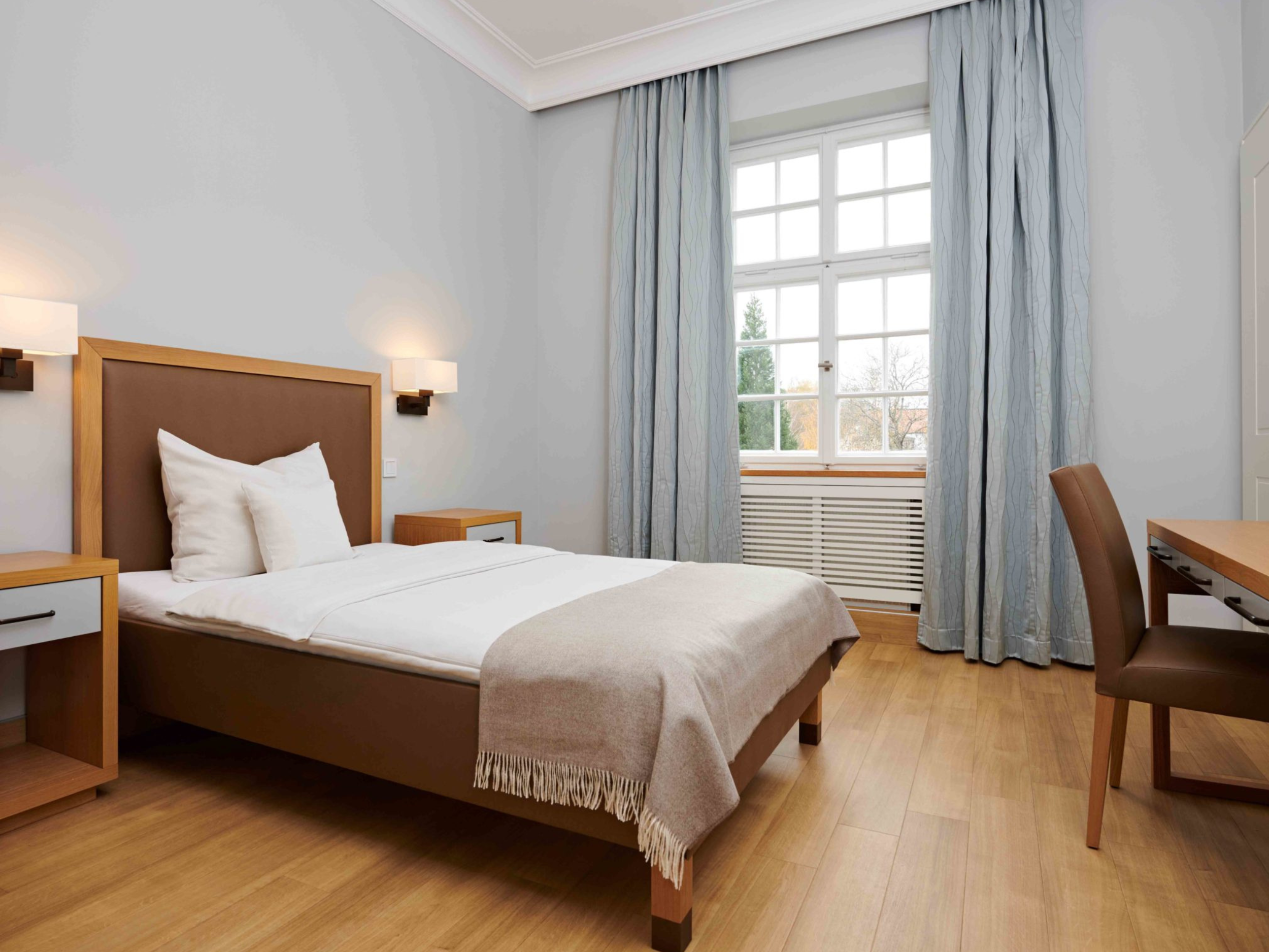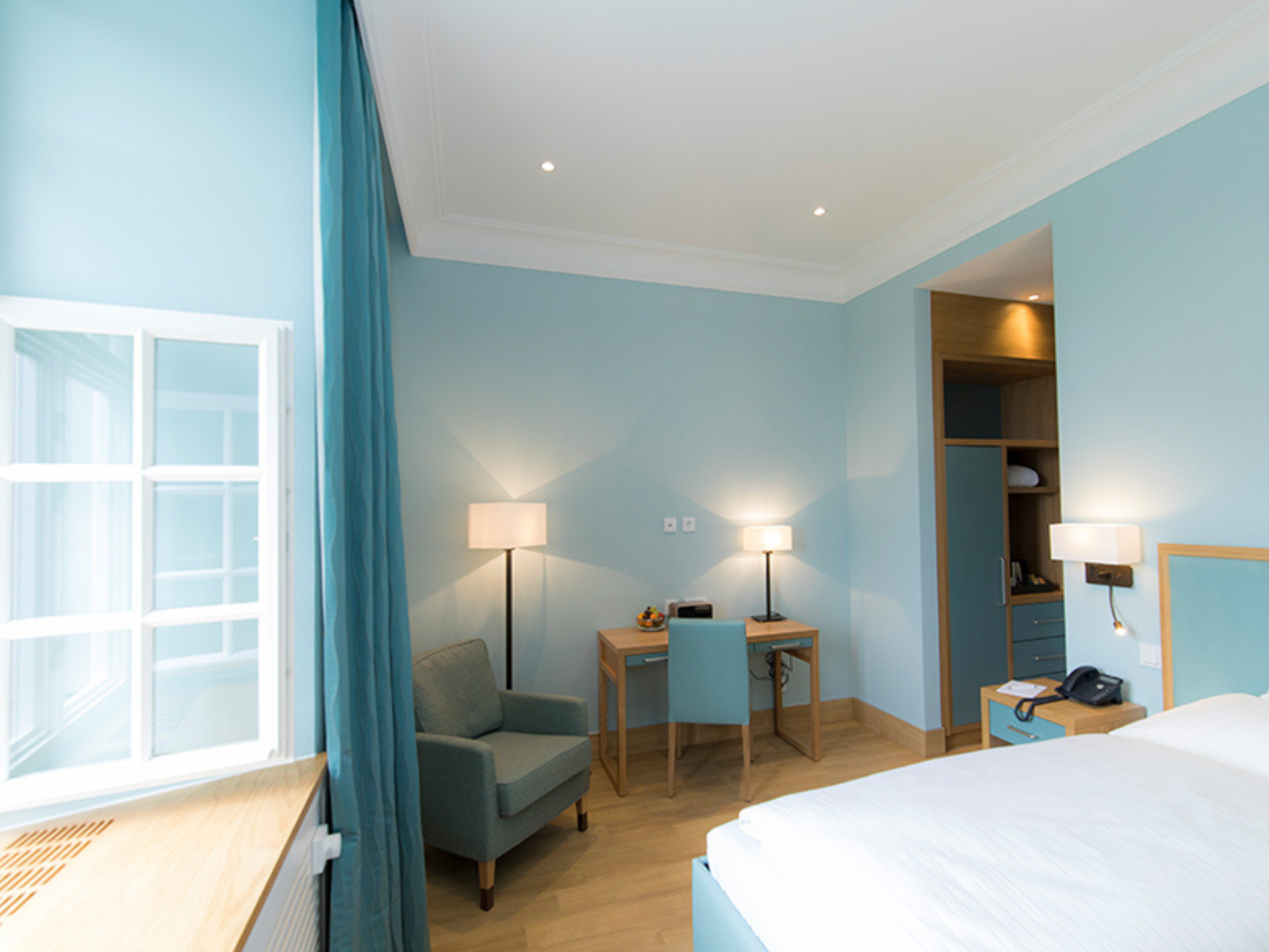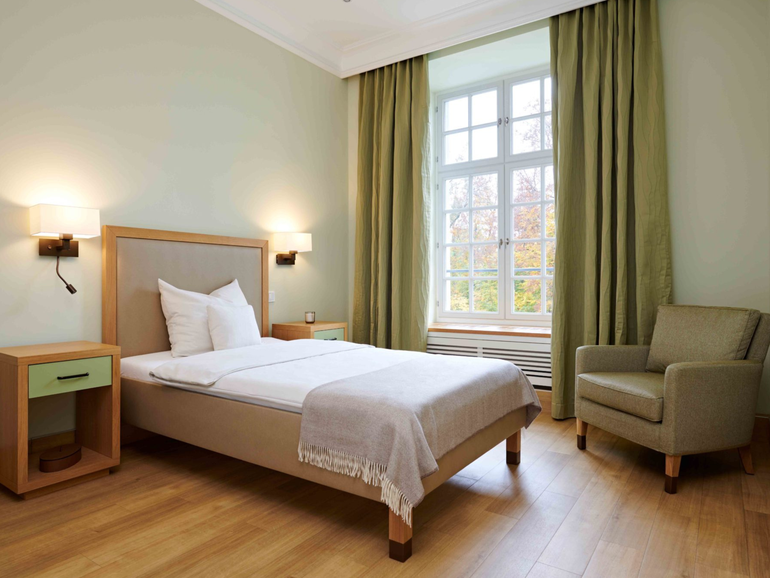Besonders wichtig war uns, die historische Substanz der Klosterräume zu bewahren und diese mit den modernen Ansprüchen einer Klinik zu kombinieren. Für die Patientenzimmer entwickelten wir ein gesundheitsförderliches Farbkonzept, das in Kombination mit warmen Materialien und individuell entworfenen Möbeln für Wohlbefinden bei den Patienten während des Aufenthalts sorgt.